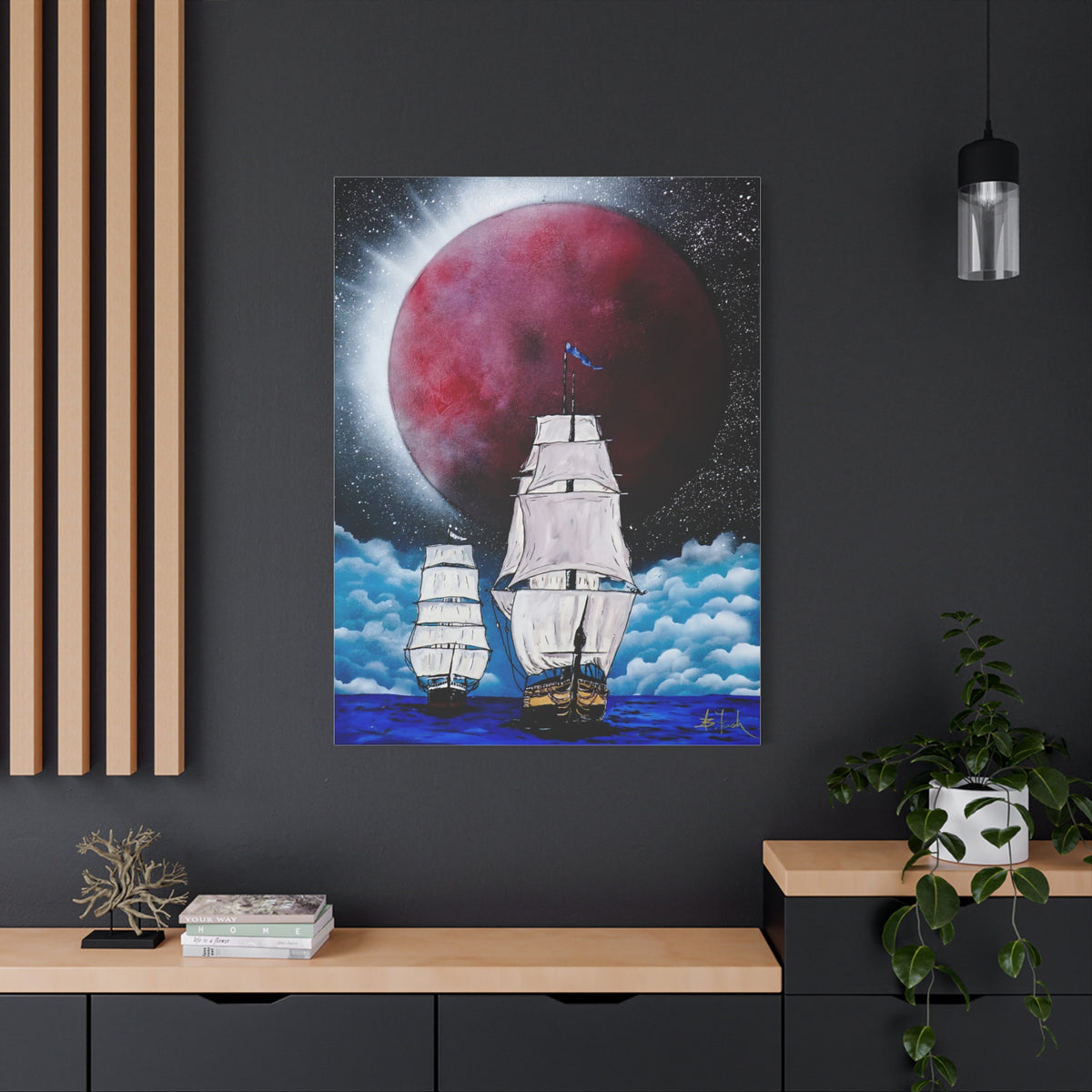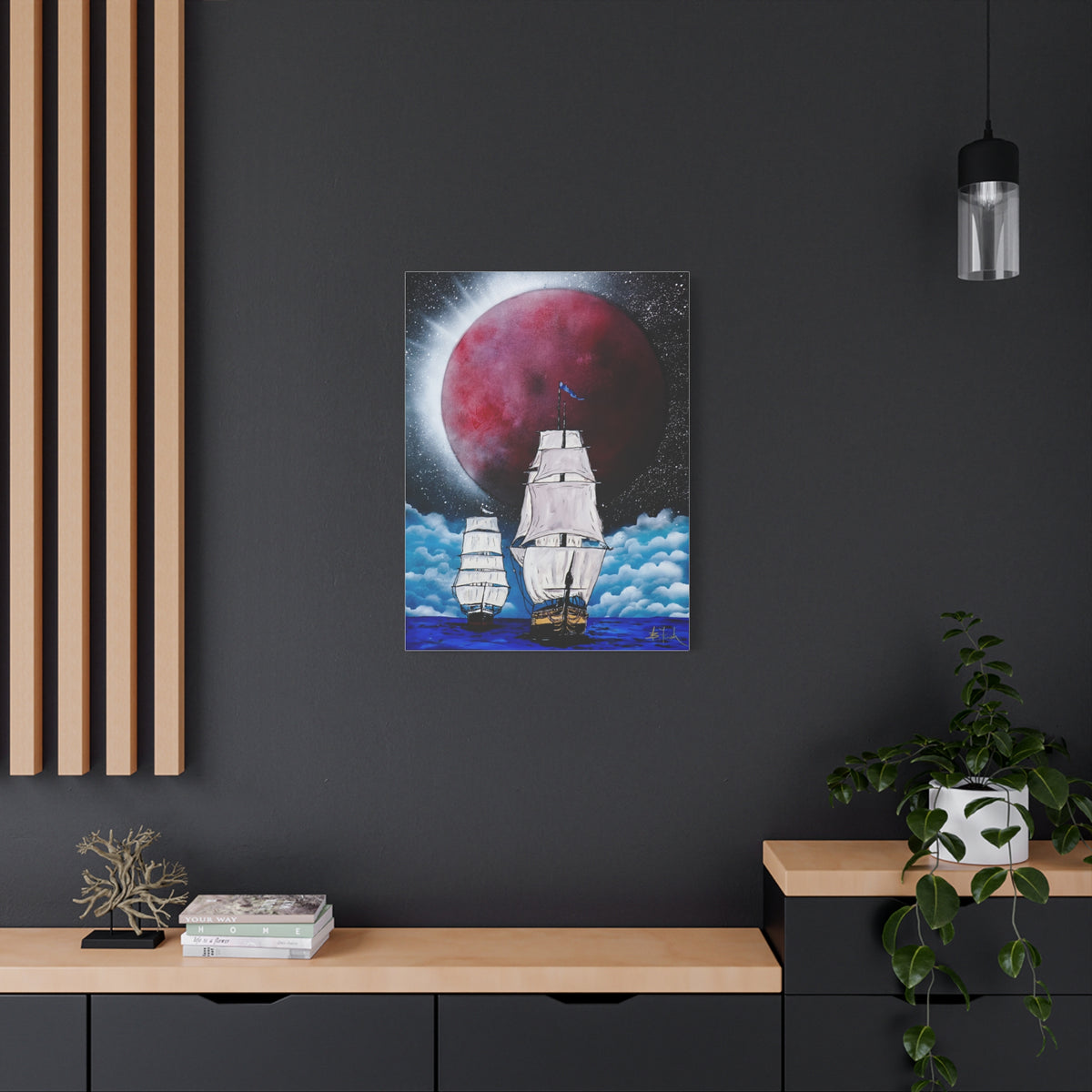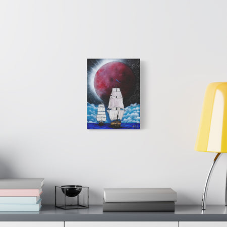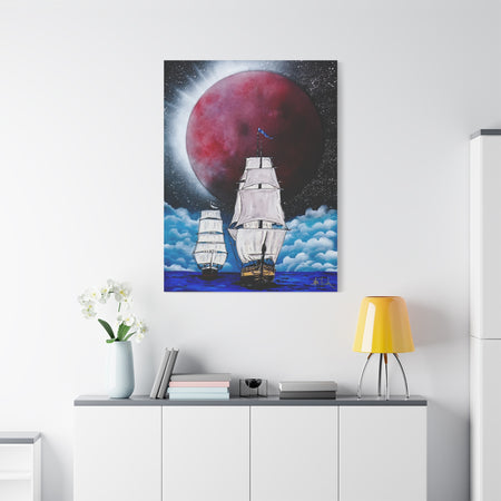 A stunning canvas featuring a captivating design of ships sailing under a blood-red moon, giving off a mysterious and adventurous vibe. Perfect for those who love nautical themes and dark, atmospheric art. Ideal for Halloween decorations, pirate enthusiasts, and fans of gothic decor.
