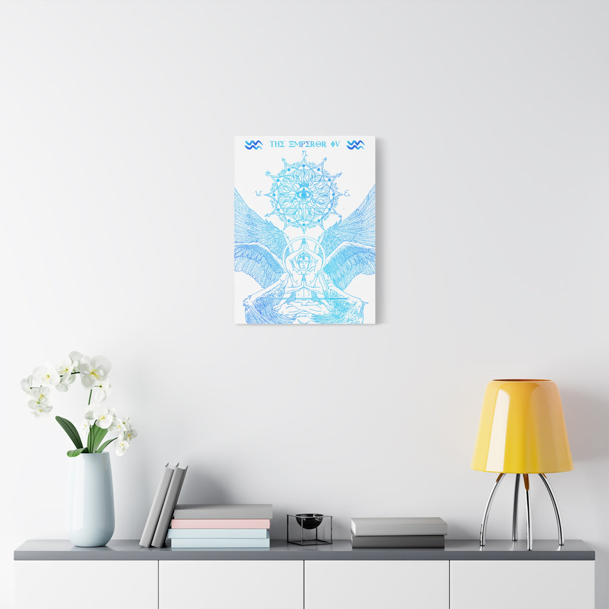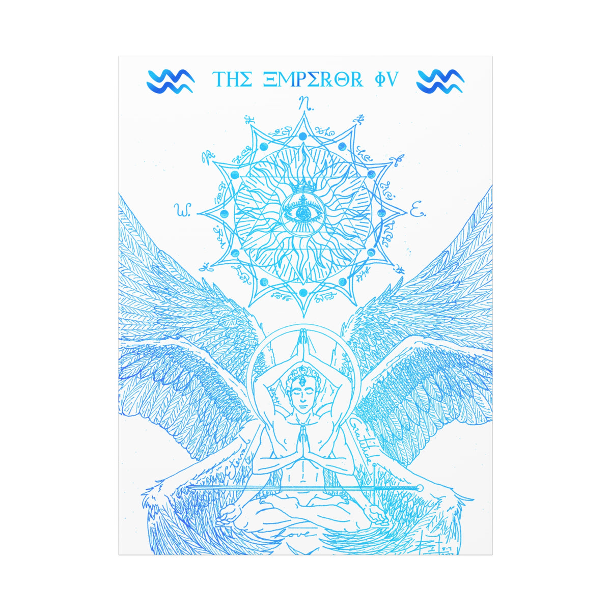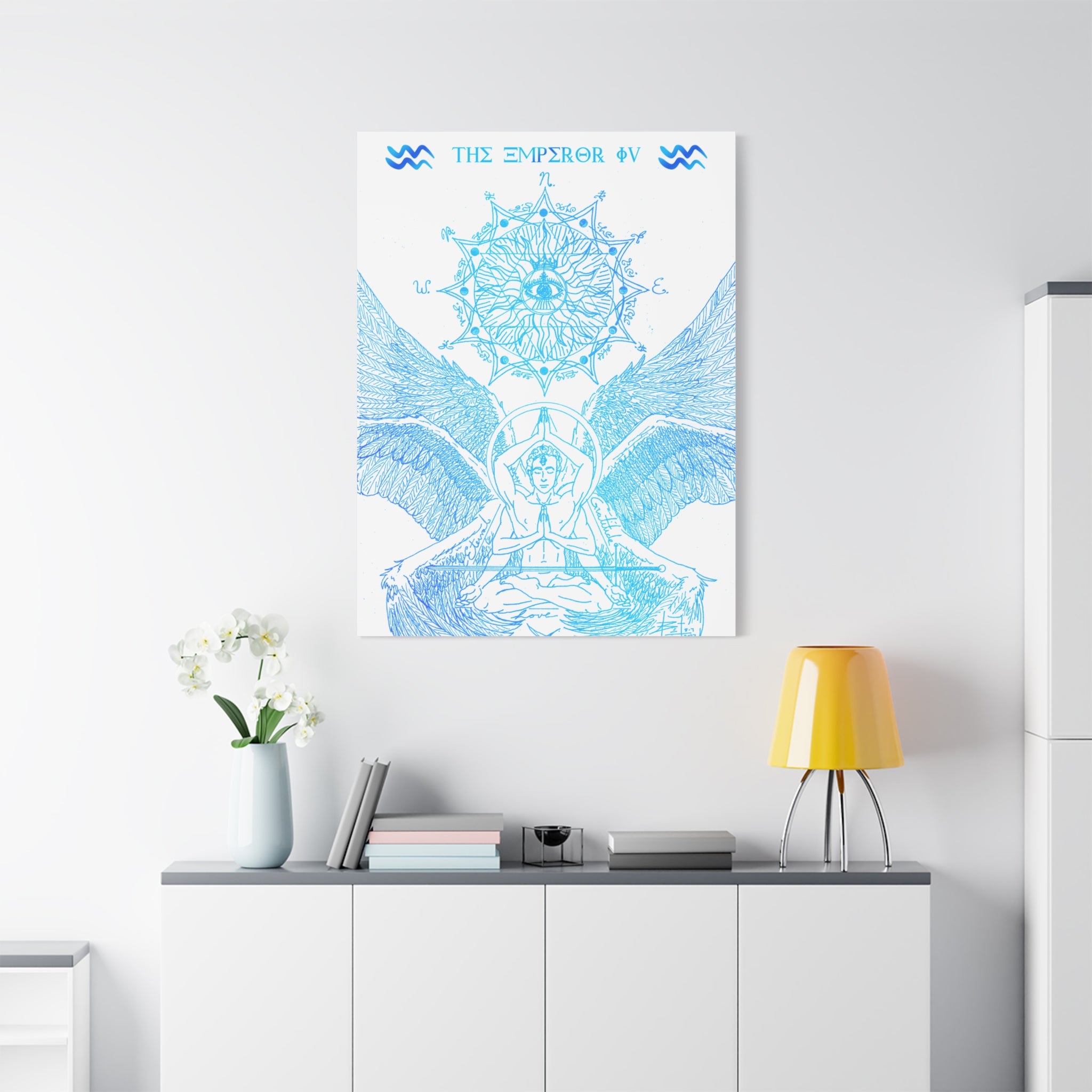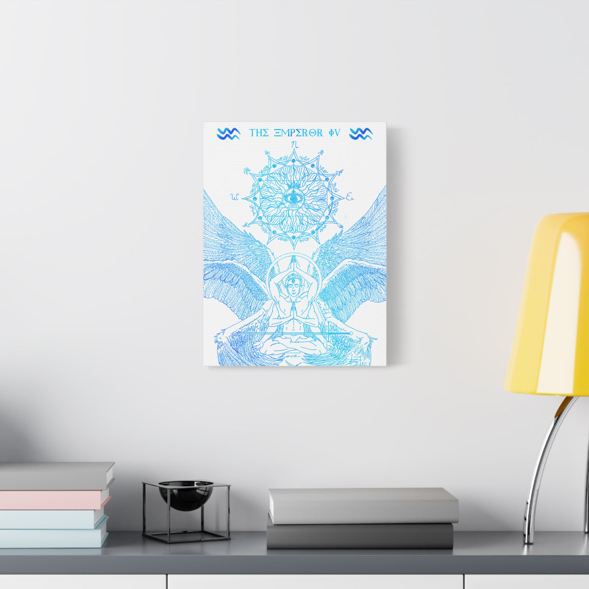 The Emperor IV XIII Angel Blue Aquarius New Age Gate canvas print exudes a mystical and spiritual vibe, perfect for those interested in astrology and spirituality. This canvas print can elevate any room's decor and is perfect for individuals who enjoy unique and intricate art pieces. Ideal for gifting on birthdays, housewarmings, or as a special treat for oneself.